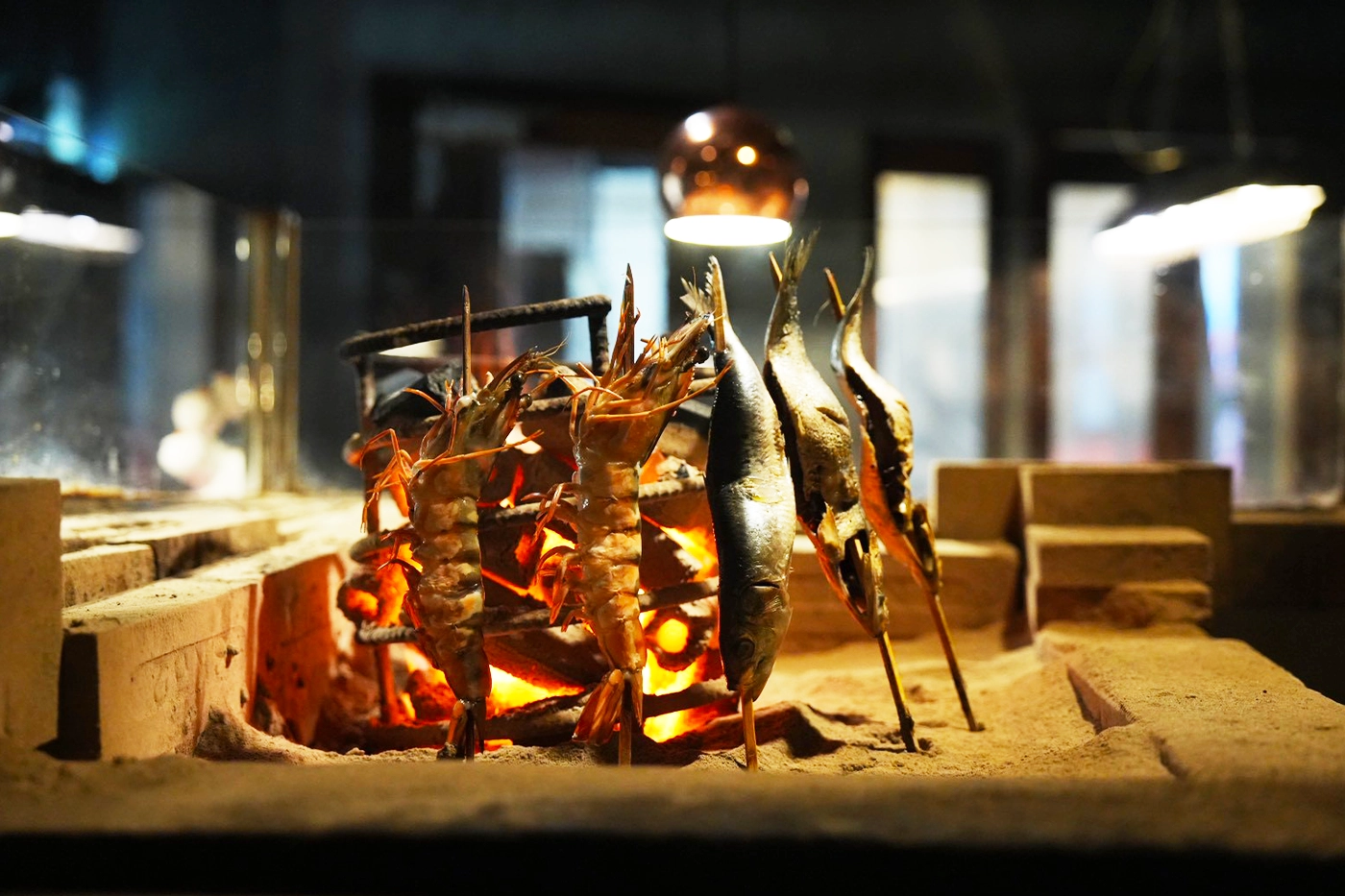 名物「大とろイワシ」や特大えび、季節の旬魚を備長炭で香ばしく焼き上げ、